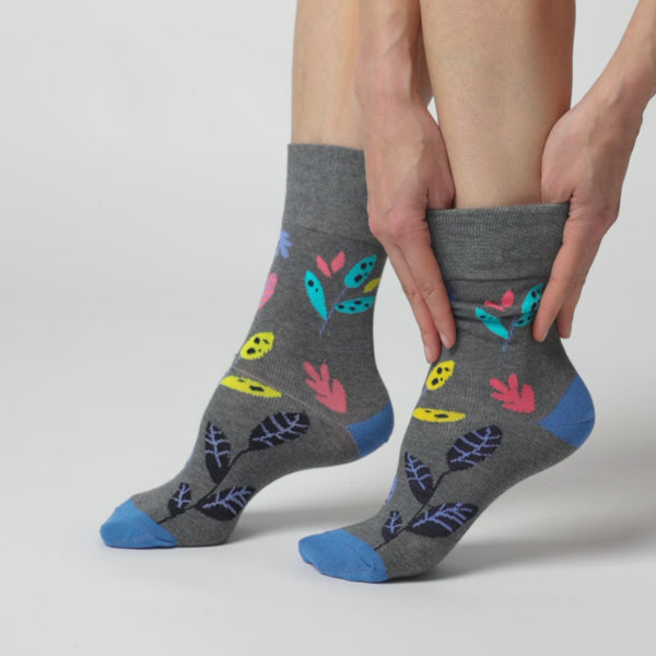 Our Ladies Gentle Grip Colourburst Cotton Socks in Floral Pop design are the number one solution for people who find regular socks tight and uncomfortable. These comfortable socks feature brightly coloured leaves and flowers set against autumnal shades of petrol blue, navy and warm grey.