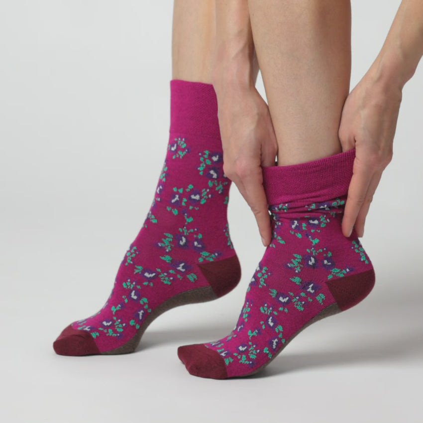 Our Ladies Gentle Grip Cotton Socks in Rose Floral Pink design are the number one solution for people who find regular socks tight and uncomfortable. These comfortable socks feature rambling summer roses in deep pink, rich purple and earthen brown.