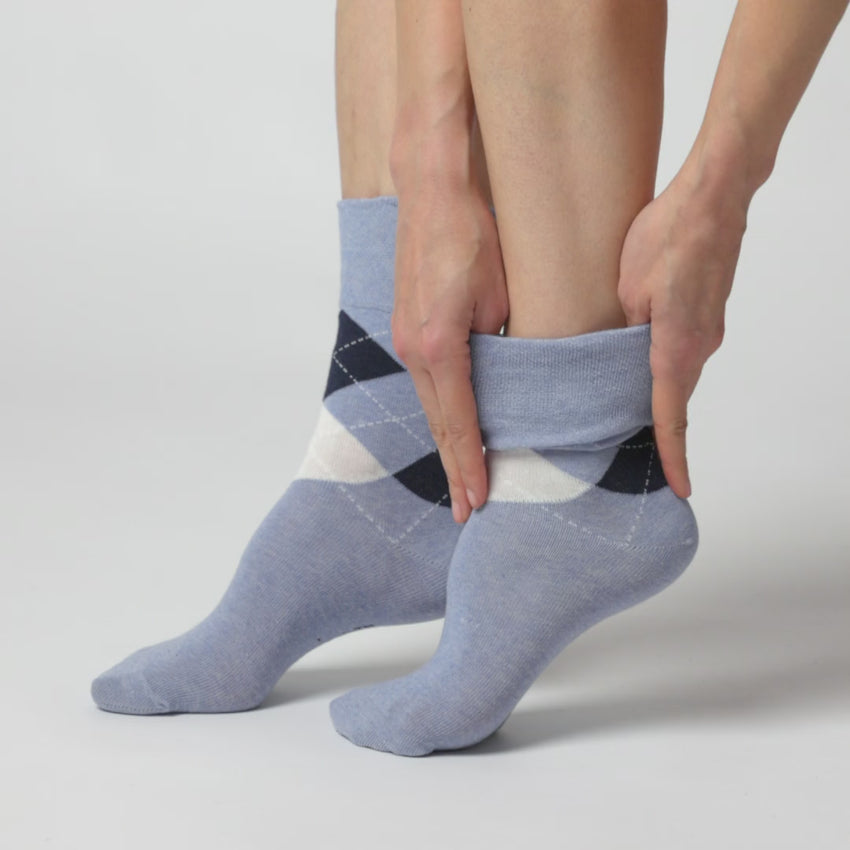 Our Ladies Gentle Grip Highlands Argyle Cotton Socks in Navy/Denim design are the number one solution for people who find regular socks tight and uncomfortable. These comfortable socks feature the classic Argyle diamond design in a mix of blue shades that pairs perfectly with jeans.