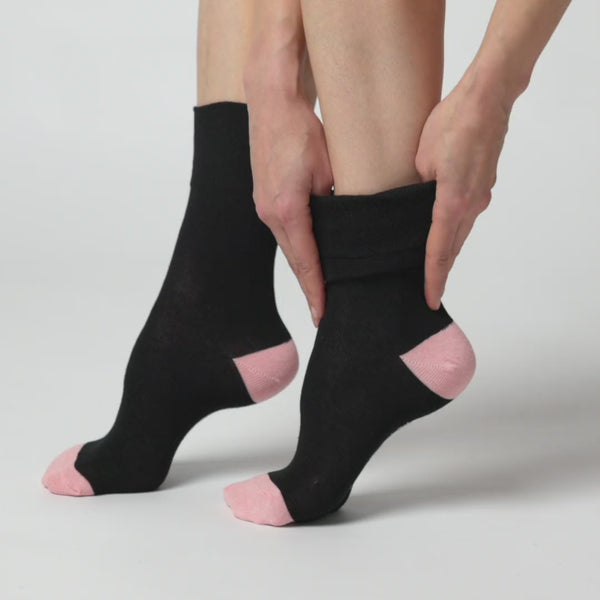 Our Ladies Gentle Grip Seclude Contrast Heel & Toe Cotton Socks in Black design are the number one solution for people who find regular socks tight and uncomfortable.