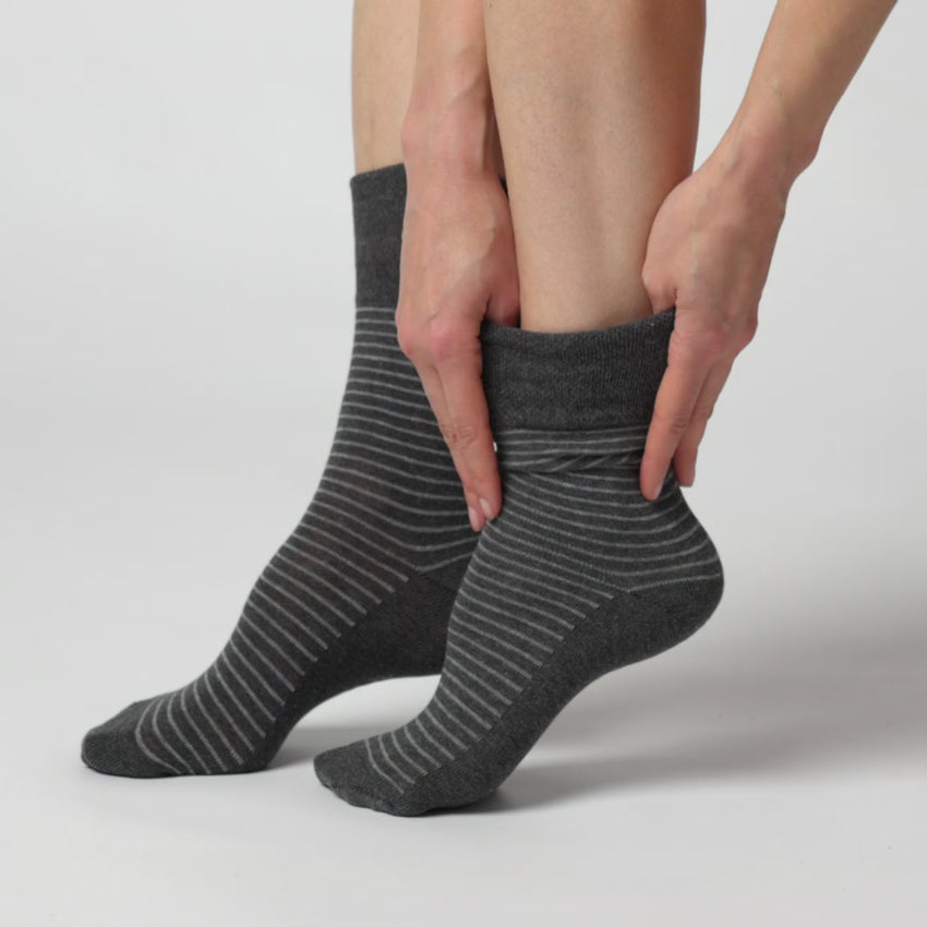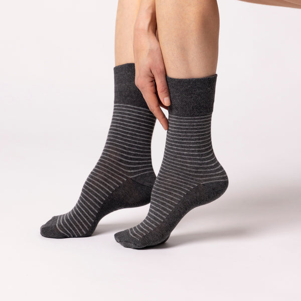 Our Ladies Gentle Grip Varsity Fine Stripe Cotton Socks in Charcoal/Grey design are the number one solution for people who find regular socks tight and uncomfortable. These comfortable socks feature a beautifully understated grey mix with thin stripes. Great with formal outfits or black trousers.