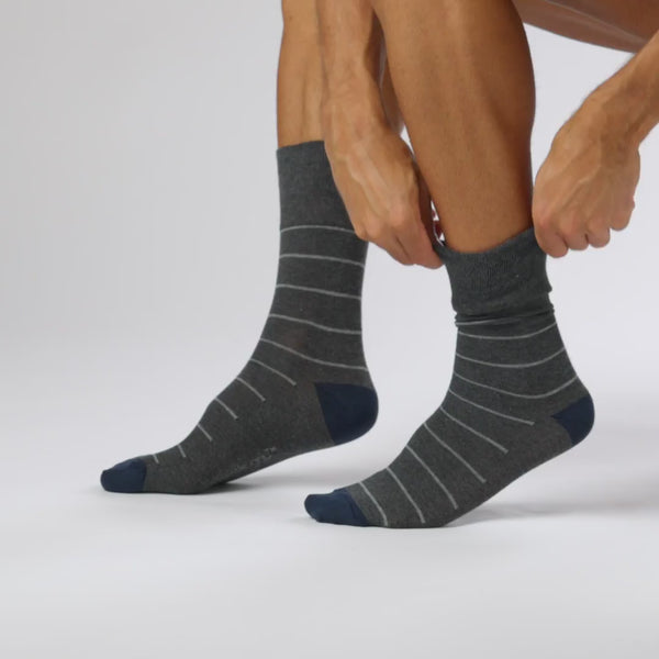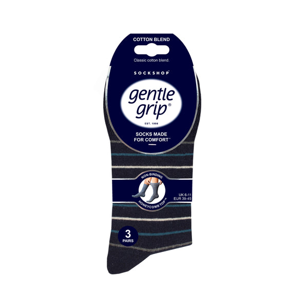 Our Men's Gentle Grip Cotton Socks in striped design are the number one solution for people who find regular socks tight and uncomfortable. These comfortable socks feature mixed stripes on bases of navy, blue and grey.