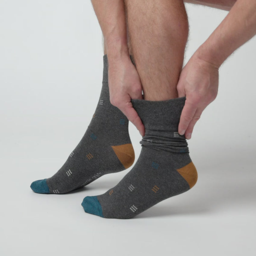 Our Men's Gentle Grip Cotton Socks in Geometric Myriad design are the number one solution for people who find regular socks tight and uncomfortable. These comfortable socks feature discreet geometric forms in gold and green scattered over bases of grey and warm white, with contrast heel.
