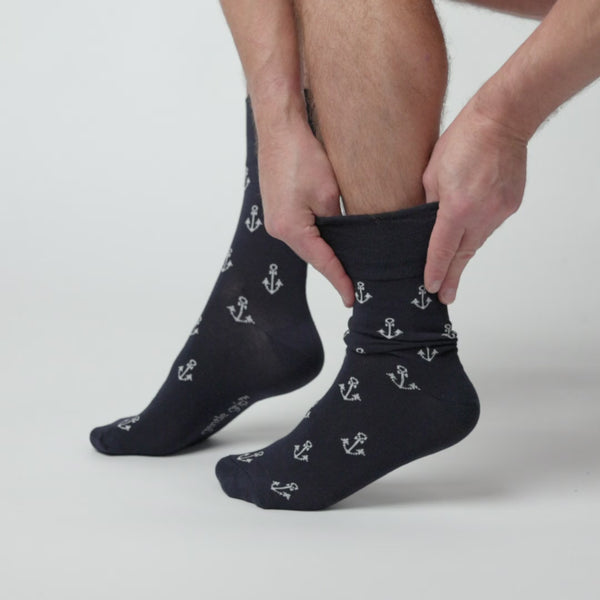 Our Mens Gentle Grip Holiday Cotton Socks in Anchor/Boat/Shark design are the number one solution for people who find regular socks tight and uncomfortable. These comfortable socks feature yachts, anchors and sharks against bases of grey, denim and navy to evoke a life on the ocean wave.
