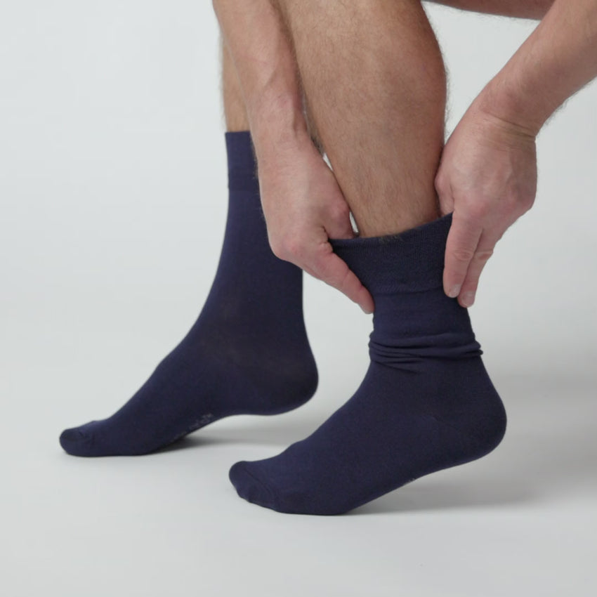 Our Men's Gentle Grip Plain Cotton Socks in Navy are the number one solution for people who find regular socks tight and uncomfortable.