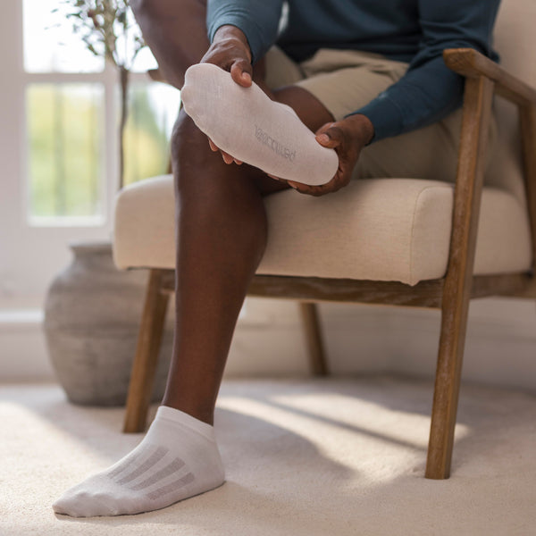 Don’t suffer from hot, sweaty feet – discover our PermaCool Cooling Trainer Socks in White. Our innovative cooling socks have a unique design to keep air moving over the skin, whisking moisture away without absorbing it and keeping the feet cooler, dryer and potentially healthier than regular cotton socks. Available in a trainer sock length, these anti-sweat socks boost evaporation to keep your feet dry, cool and comfortable.